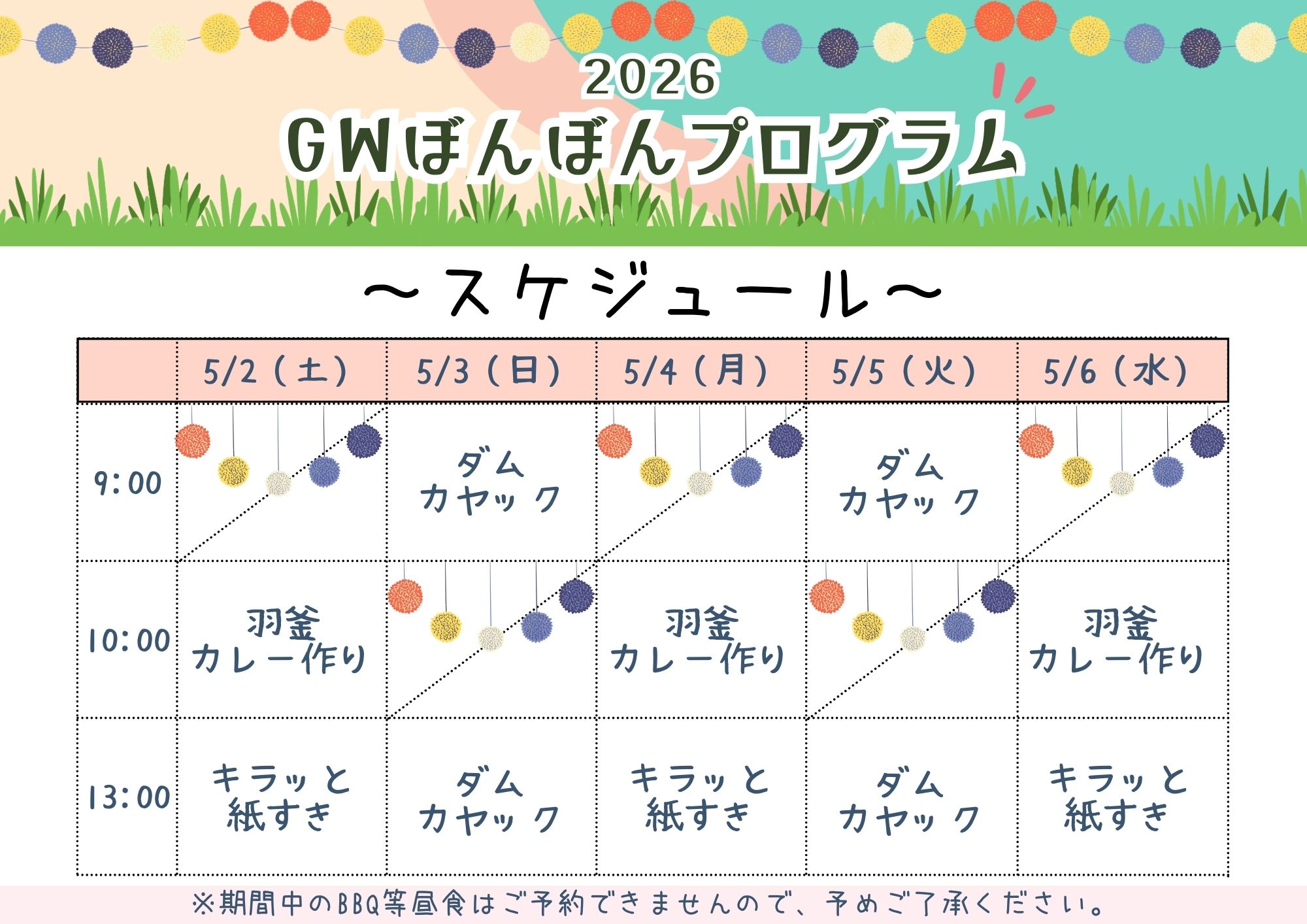 ※GW期間中のBBQ等昼食はご予約いただけません。
