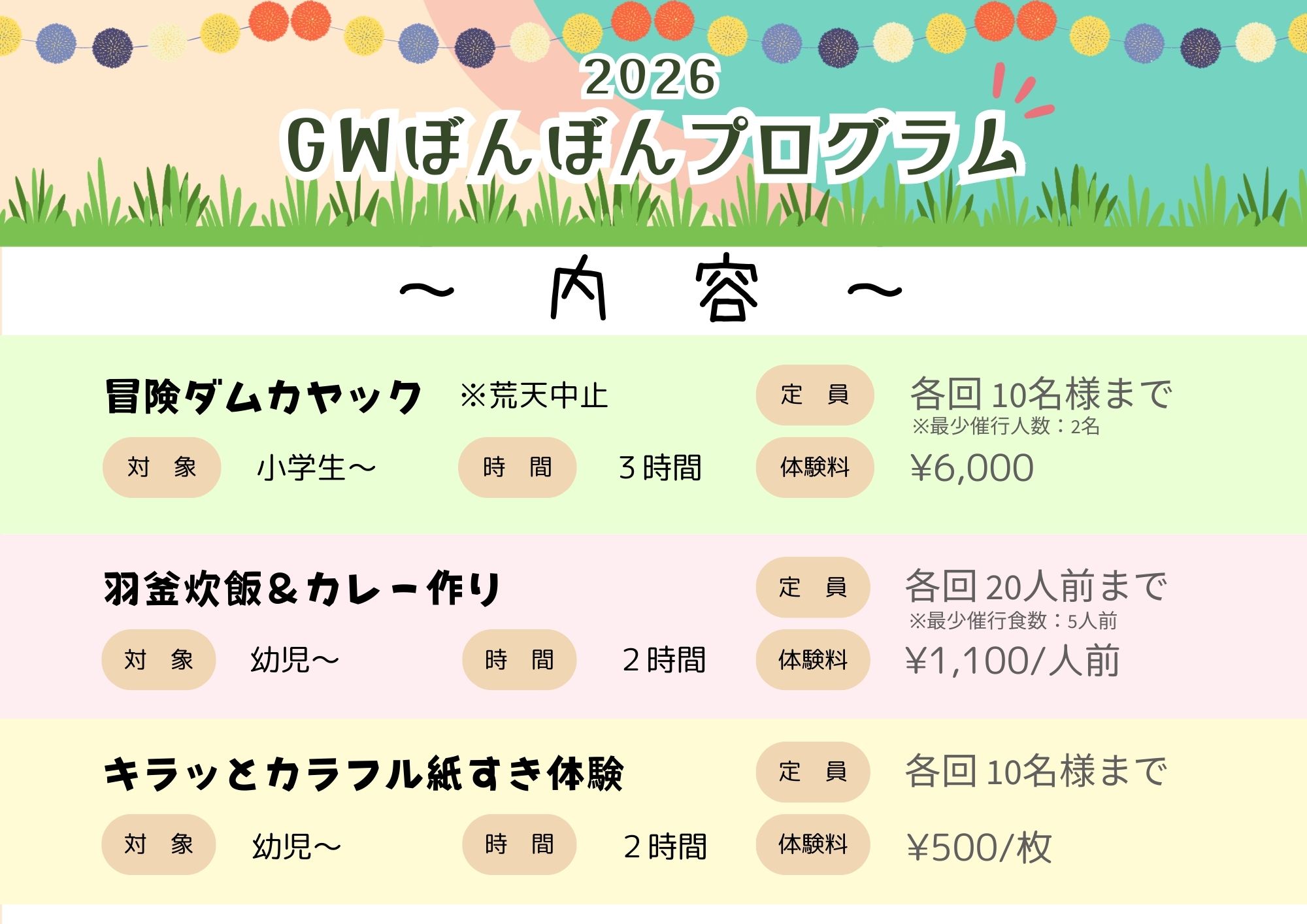 ゴールデンウィーク期間中は、日時によって体験できるプログラムが異なります。